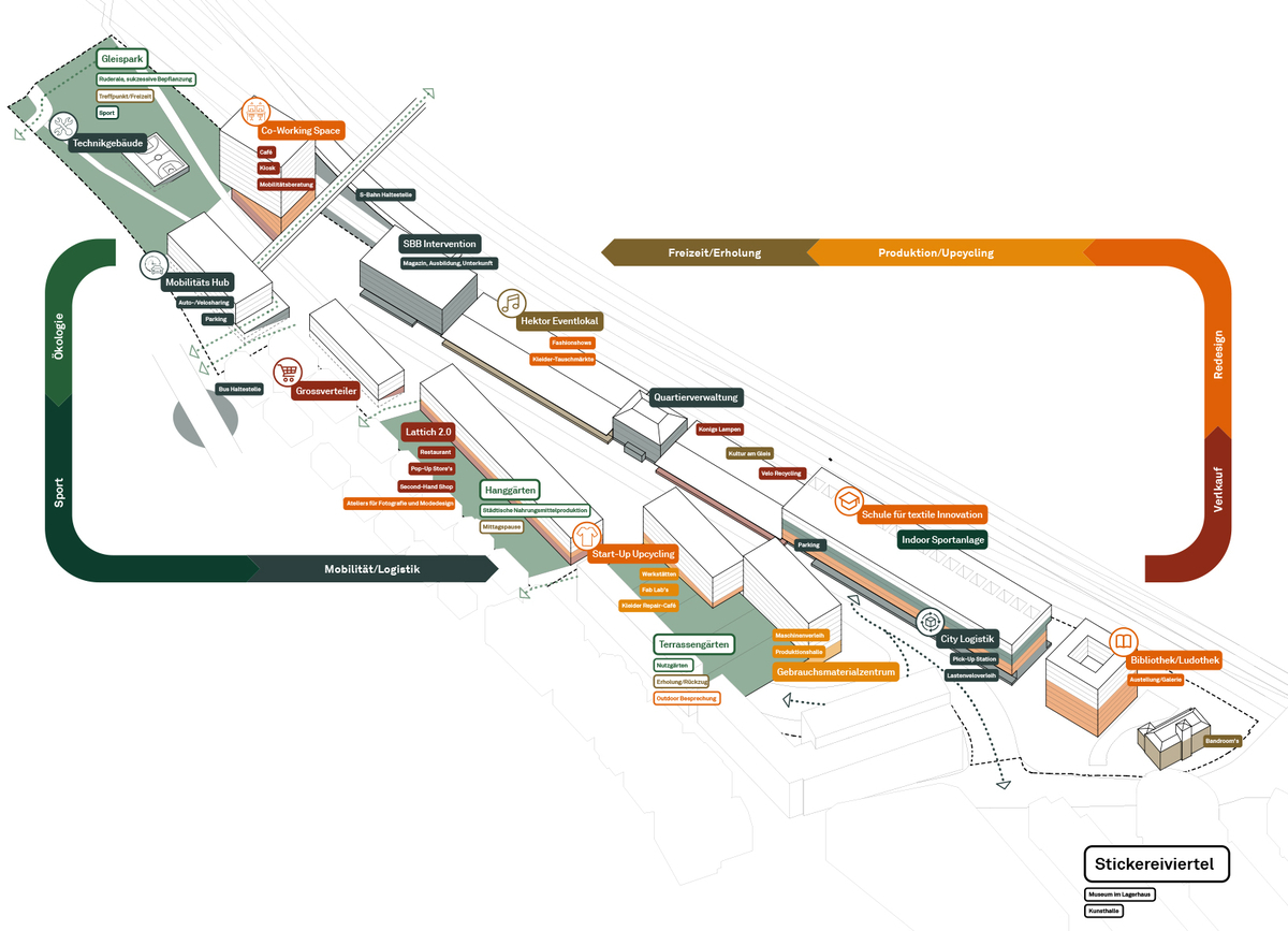 Im anspruchsvollen Spannungsfeld von Städtebau des 21. und Verkehrserbe des 20. Jahrhunderts mit einem Autobahnanschluss mitten in der Stadt haben wir entlang des Leitmotivs «Weiterstricken des Stickereiareals» ein spezifisches, ortsbezogenes und vielseitiges Nutzungskonzept entwickelt.