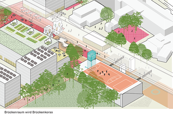 Für den von Hochbau Stadt Bern ausgeschriebenen Wettbewerb «Entwicklung Gaswerkareal und Brückenkopf West: Das neue Berner Aarequartier» hat sofa*p zusammen mit Yellow Z Urbanism Architecture AG Zürich, Westpol Landschaftsarchitektur Basel, Schneiter Verkehrsplanung AG Zürich und Grolimund+Partner AG Bern ein städtebauliches Angebot formuliert. Der Bericht des Preisgerichts vom Oktober 2021 schätzt den integrativen Ansatz zur An- und Einbindung des Gaskessels sowie die gelungene Verflechtung mit Umgebung und Freiraum. Der Brückenkorso aktiviert den Raum unter der Monbijoubrücke als inklusiven Begegnungsraum für alle und eröffnet interessante Spielräume.